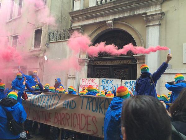 “See you on the barricades!” was the message from the activists pictured above in Venice, Italy, who were part of a day of anti-bank actions on March 2.