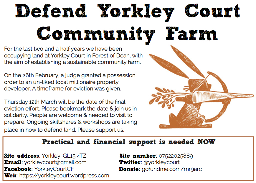 Thursday March 12 has been named by land activists as the date of the final eviction efforts at Yorkley Court in the Forest of Dean. As we reported in Acorn 3, for the last two and a half years residents have been trying to establish a sustainable community farm. But on February 26 a local millionaire property developer Brian Bennett won his court case for possession. A call-out has now been made for supporters to come and show their solidarity on the day.