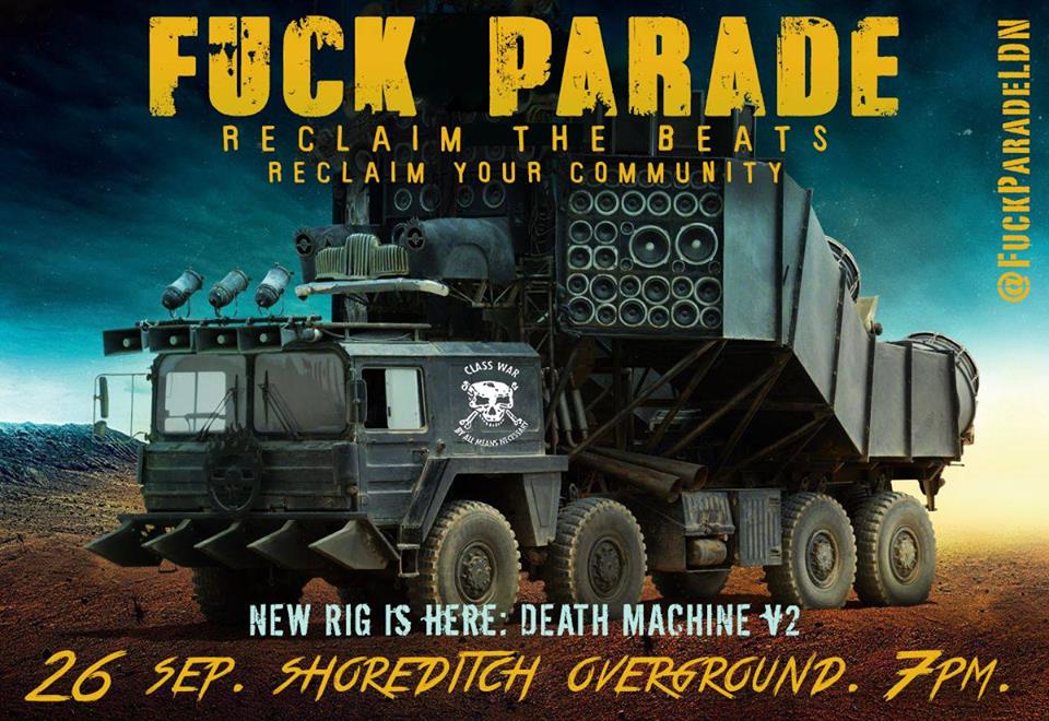 A street party against the gentrification of London is being staged in Shoreditch on Saturday September 26. Says the call-out for Fuck Parade 3: “Our communities are being ripped apart – by Russian oligarchs, Saudi Sheiks, Israeli scumbag property developers, Texan oil-money twats and our own home-grown Eton toffs. Local authorities are coining it in, in a short sighted race for cash by ‘regenerating’ social housing. We will protest this economic warfare with a street party on September 26th”. Meet Shoreditch overground station from 7pm.