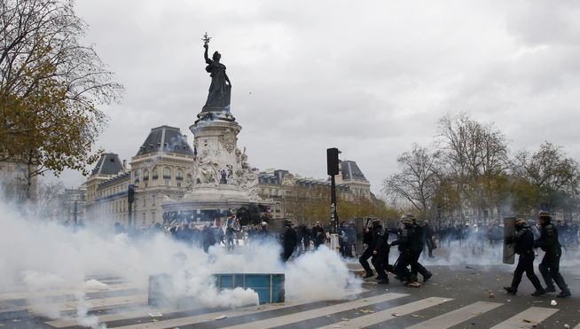 Tear gas and grenades were fired by French riot cops against brave activists who defied martial law in France – and more than 200 people were arrested.