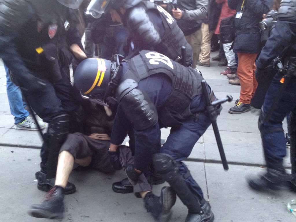 They were blocked into the square by an army of police, with checkpoints out of sight in the Metro. An hour of static protest was apparently all that the French state was prepared to tolerate. At 3pm police shouted through megaphones: “Dispersez-vous, nous allons faire évacuer la place!” – “Disperse! We are going to clear the square!”