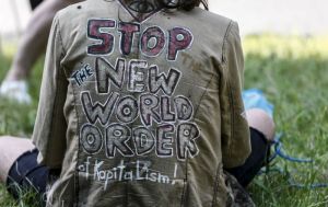 A protester sits on the ground next to a police check point prior to the Bilderberg meetings at Interalpen Hotel in the Austrian village of Buchen