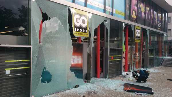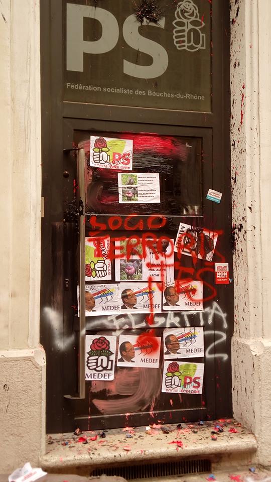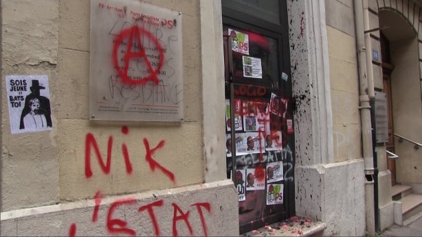 In Brittany, the main railway line was blocked in Rennes city centre, while banks, chain stores and the Socialist Party offices were targeted in Nantes.
