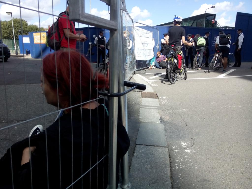 Multiple defendants are accused of having blockaded the road during the Stop The Arms Fair main day of action on September 12; of which three are accused of blocking the East gate of the ExCel centre by locking themselves to the gate with arm tubes and two are accused of obstructing the West gate by D-locking their necks to the gate.