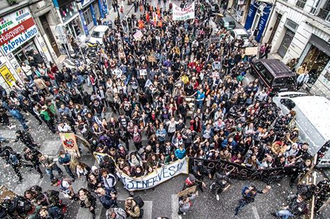 April 28 saw a big day of strikes and protests against the neoliberal Loi Travail “reforms” in France (see Acorn 23 and this update). Feisty protests and brutal police violence broke out all over the country – see, for instance, these videos from Paris and Rennes and this photo report from Nantes – while Nuit Debout public assemblies were held in hundreds of towns in the evening. We received this first-hand report from the protests in Marseilles.
