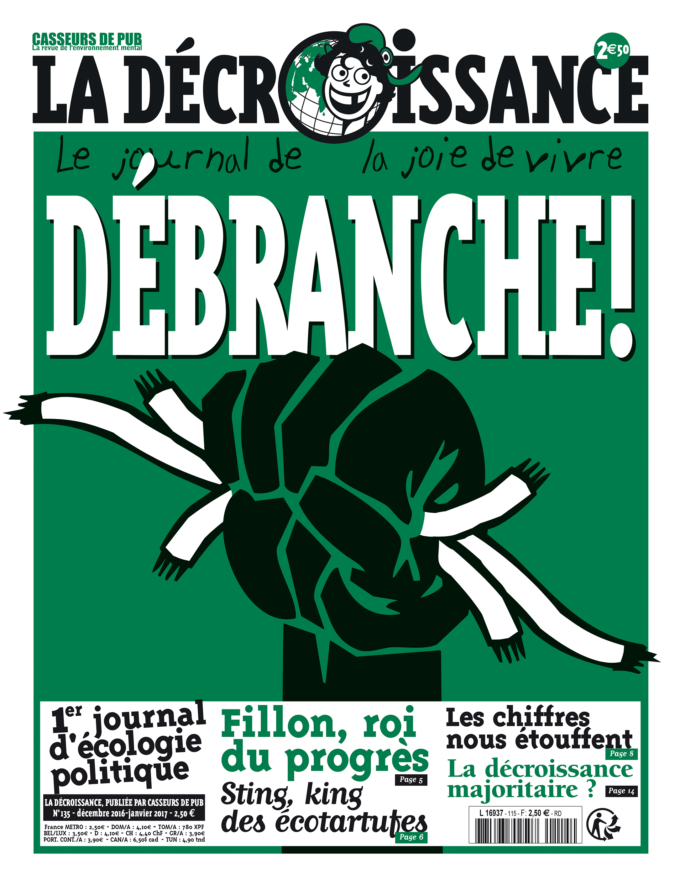 The current issue, December 2016 to January 2017, features a striking green and black cover and the word “Débranche!” (“Unplug!”) with a large fist clasping a handful of ripped-out wiring.