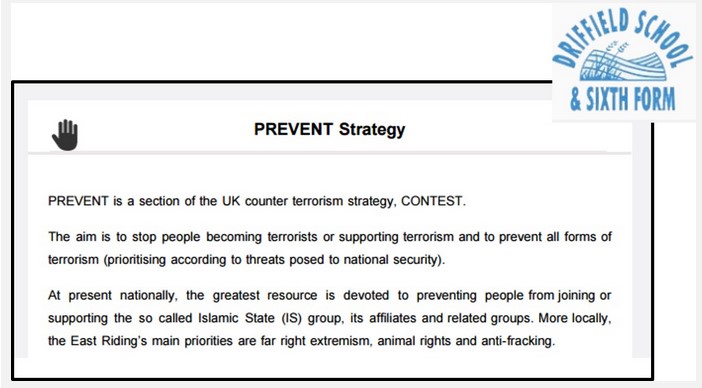 The Drill or Drop blog reported that Driffield School and Sixth Form in East Yorkshire had earlier this year unveiled a Prevent strategy which included this statement: “At present nationally, the greatest resource is devoted to preventing people from joining or supporting the so called Islamic State (IS) group, its affiliates and related groups. More locally, the East Riding’s main priorities are far right extremism, animal rights and anti-fracking.”