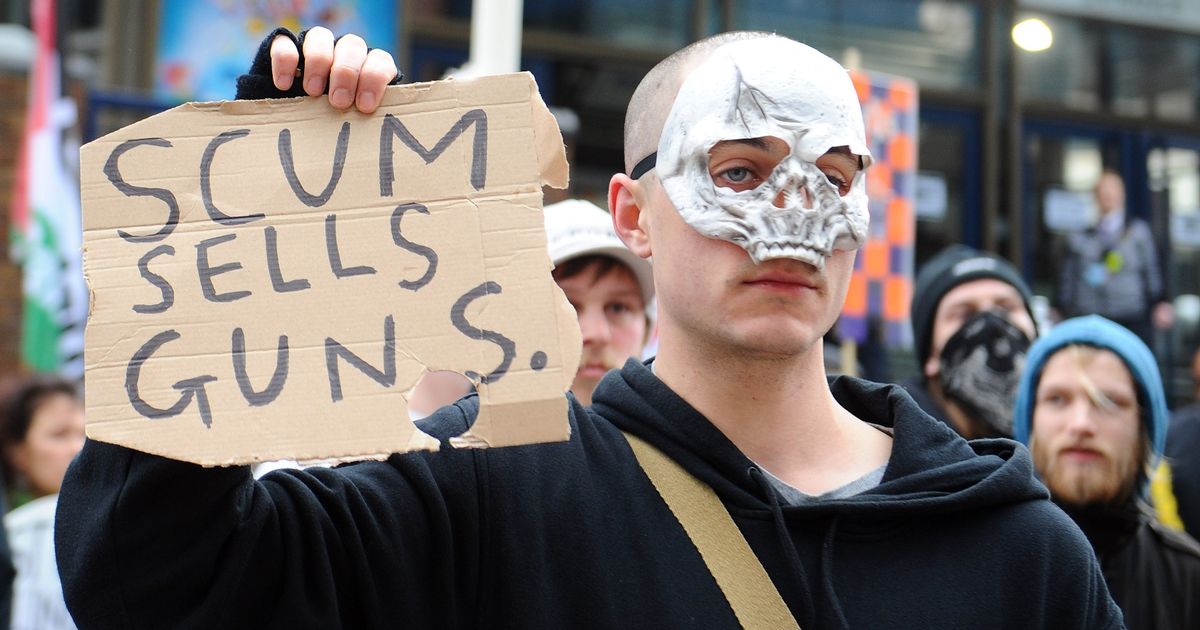 “These ruthless businesses build their wealth on the rubble of schools and hospitals and on the dead bodies of the children targeted by the weapons of mass destruction they manufacture and sell across the world.