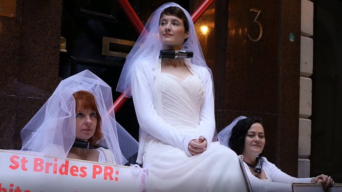 Three protesters dressed as brides chained themselves to the door of London PR firm St Brides Partners, declaring that PR firms that are “wedded to the fracking industry are locking the UK into a toxic marriage that funds dangerous and unwanted unconventional oil and gas in the UK”.