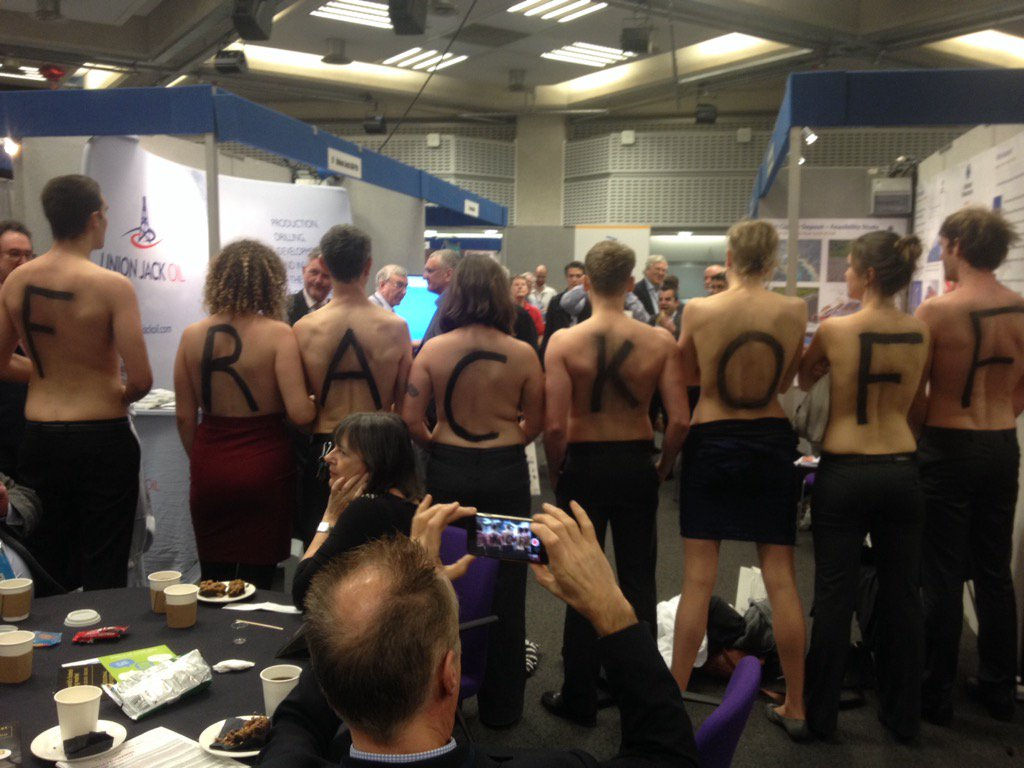 Bare-backed protesters spelled out an anti-fracking slogan and staged a noise demonstration in protest at Union Jack Oil’s stall at London’s UK Investor show. Said Reclaim the Power: “Everyone is becoming more aware of the equipment suppliers and haulage companies propping up the fracking industry because they are physically visible delivering to the fracking site in Lancashire. Events like these are doing the dirty work behind the scenes and are just as implicated and dangerous. They should be exposed.”
