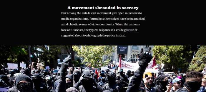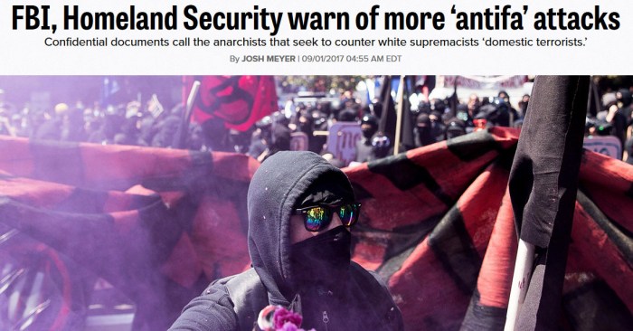 The second clue relates to the origin of its stories about the US authorities’ concerns over the Antifa “threat”. Politico tries to get away with implying that they have merely received leaked official documents but, as It’s Going Down notes, they themselves take up the official “domestic terrorist” line with great gusto.