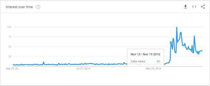 It says: “Started in late 2016 as a reference to made-up stories, hoaxes, and Onion-style parodies, ‘Fake News’ has since been adopted by Donald Trump and his supporters to describe any negative press. Those in many establishment news sources often use ‘Fake News’ to refer to ‘exaggerated, hyper-partisan, and conspiratorial journalism’. Fake News is thus perhaps best understood as a rhetorical weapon in a multi-faceted Information War.”