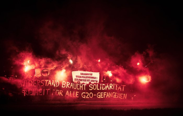 The demo in Hamburg is in protest at the massive levels of repression unleashed by an increasingly fascistic German state against anti-capitalists protesting against the G20 summit last summer.