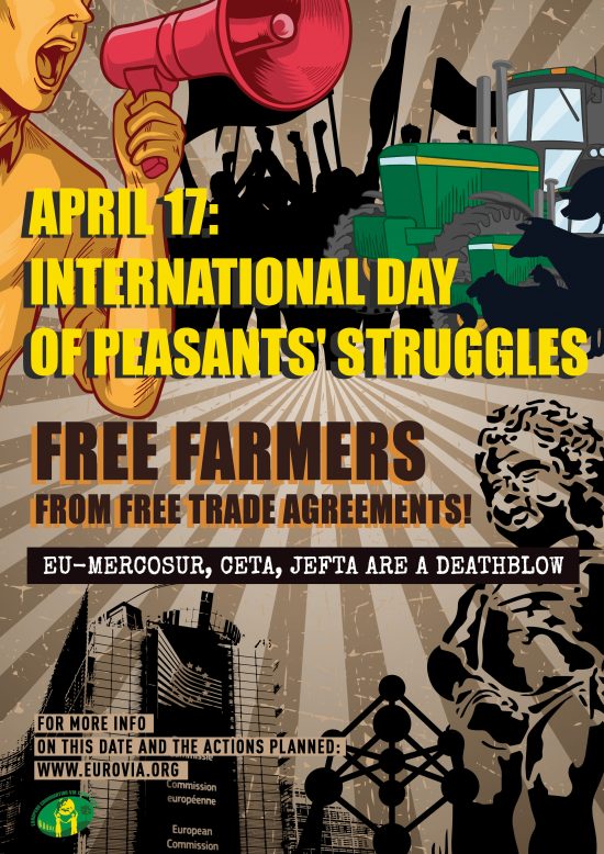 Tuesday April 17 is International Day of Peasants’ Struggles and there will be a protest in Brussels under the slogan “Free Farmers from Free Trade Agreements! MERCOSUR, CETA, JEFTA are a deathblow!” Say organisers: “Breaches of peasant rights, which outrageously happen on a daily basis, are on the rise due to free trade agreements which only serve the interests of multinationals.” The protest starts at 9am at the Belgian city’s Schuman Roundabout.