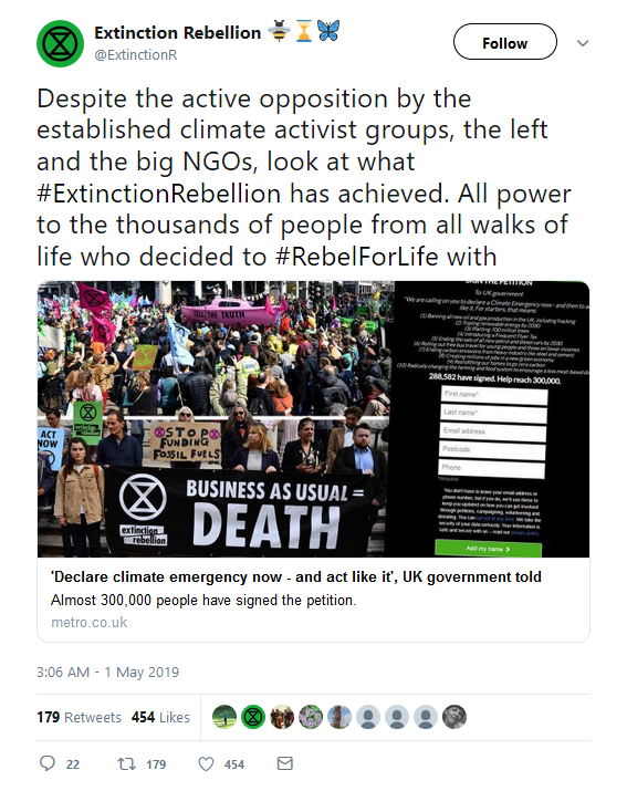 “Despite the active opposition by the established climate activist groups, the left and the big NGOs, look at what #ExtinctionRebellion has achieved” they tweeted.