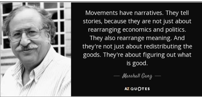 He declares, in the quote used by Guerrilla Foundation: “Movements have narratives. They tell stories, because they are not just about rearranging economics and politics. They also rearrange meaning”.