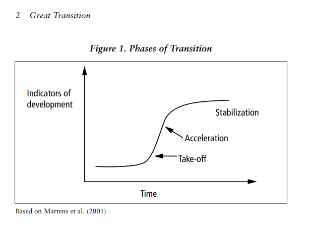 He points readers towards a 2002 essay called ‘The Great Transition: The Promise and Lure of the Times Ahead‘ from the Global Scenario Group.