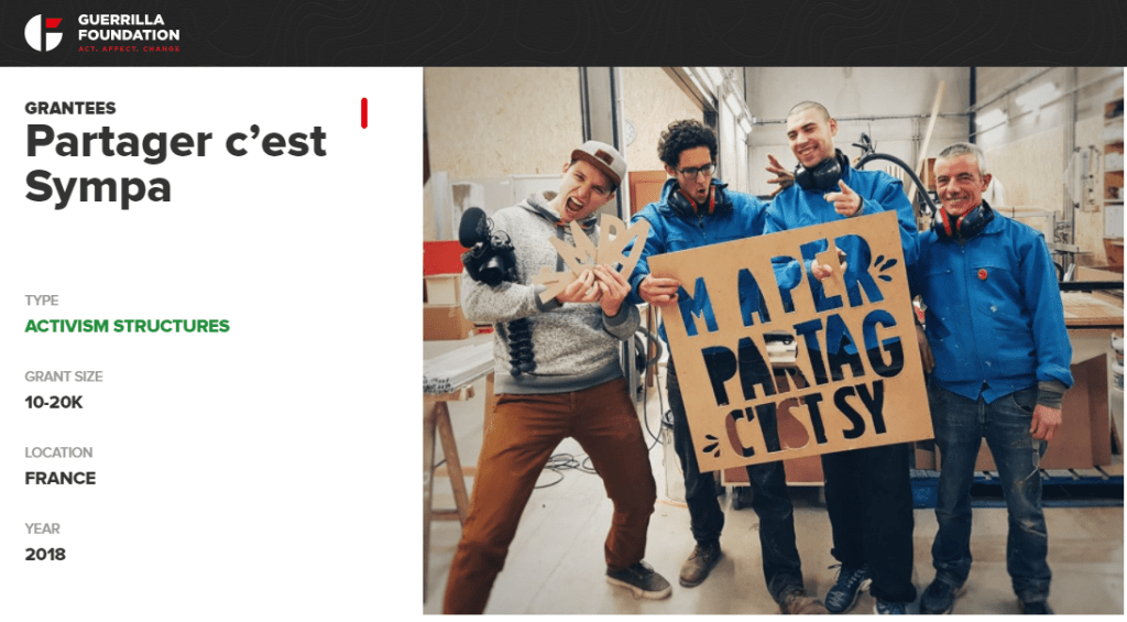 This description appears, in English, on the site of a Berlin-based organisation called Guerrilla Foundation, which has given thousands of euros to Partager c’est Sympa.