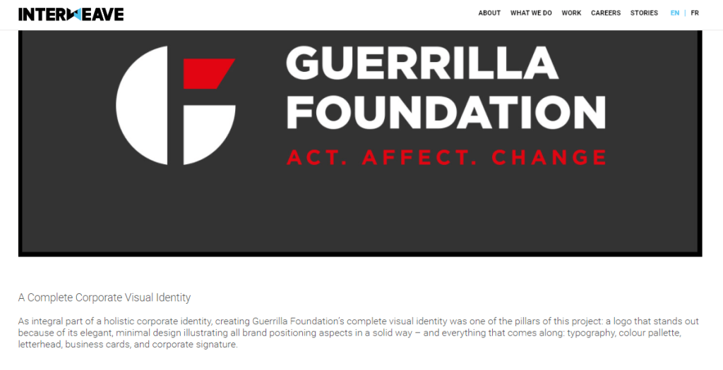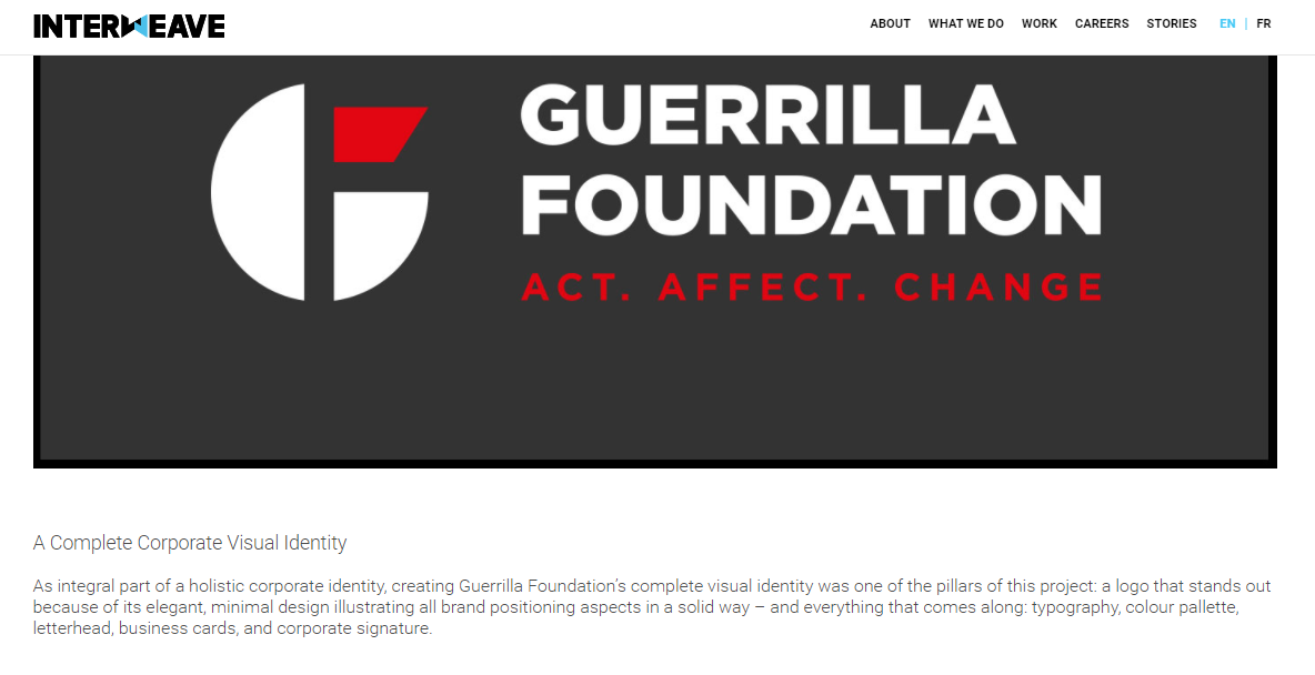 This states: “As [sic] integral part of a holistic corporate identity, creating Guerrilla Foundation’s complete visual identity was one of the pillars of this project: a logo that stands out because of its elegant, minimal design illustrating all brand positioning aspects in a solid way – and everything that comes along: typography, colour pallette, letterhead, business cards, and corporate signature”.