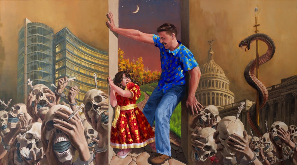 He writes: “Covid-19 opened up a whole new horizon of ideas for me. It was the forced masks that fascinated me; the societal strife and the side you aligned with was now being worn on your face – or not, and the absence of a muzzle spoke even more loudly than its presence.”