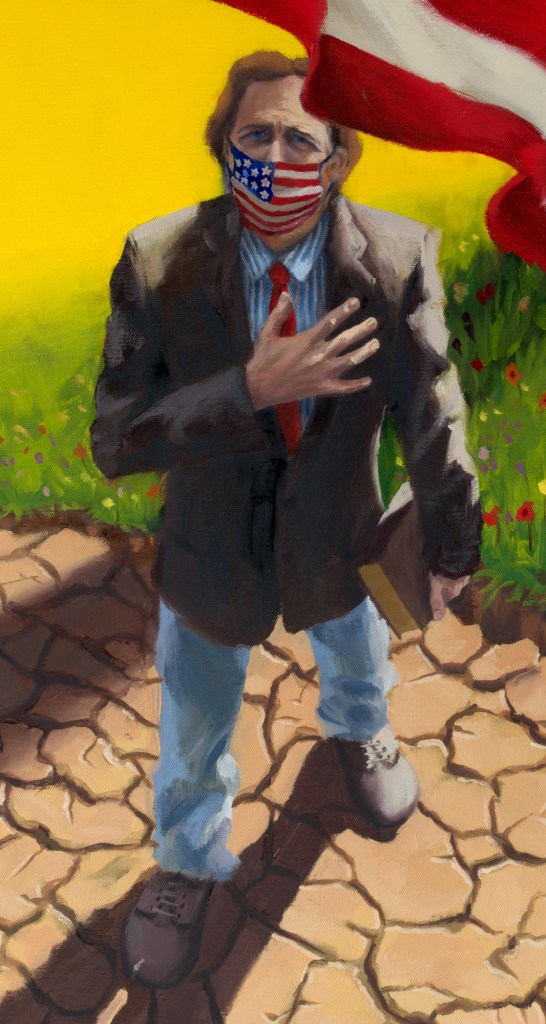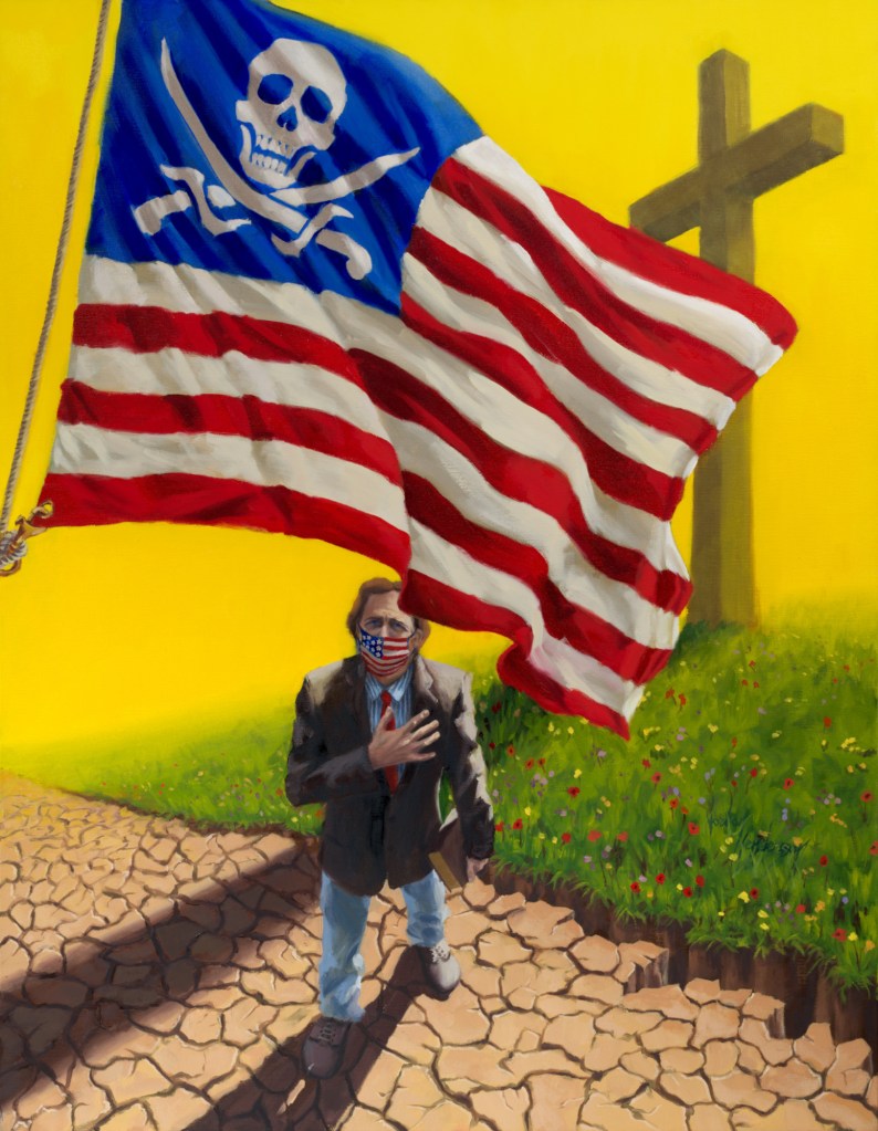The reality of people across the USA pledging their allegiance to the flag of the US federal government while wearing a Covid facemask was my initial inspiration for the painting above. I then remembered where I first learned the pledge of allegiance as a child . . . in church.¹