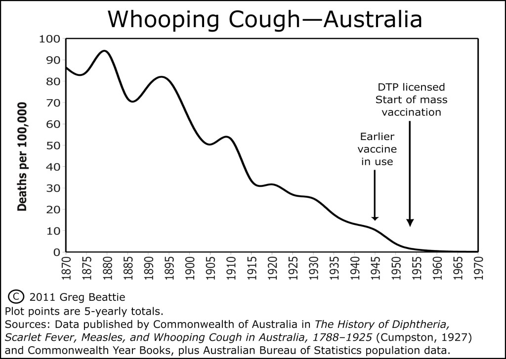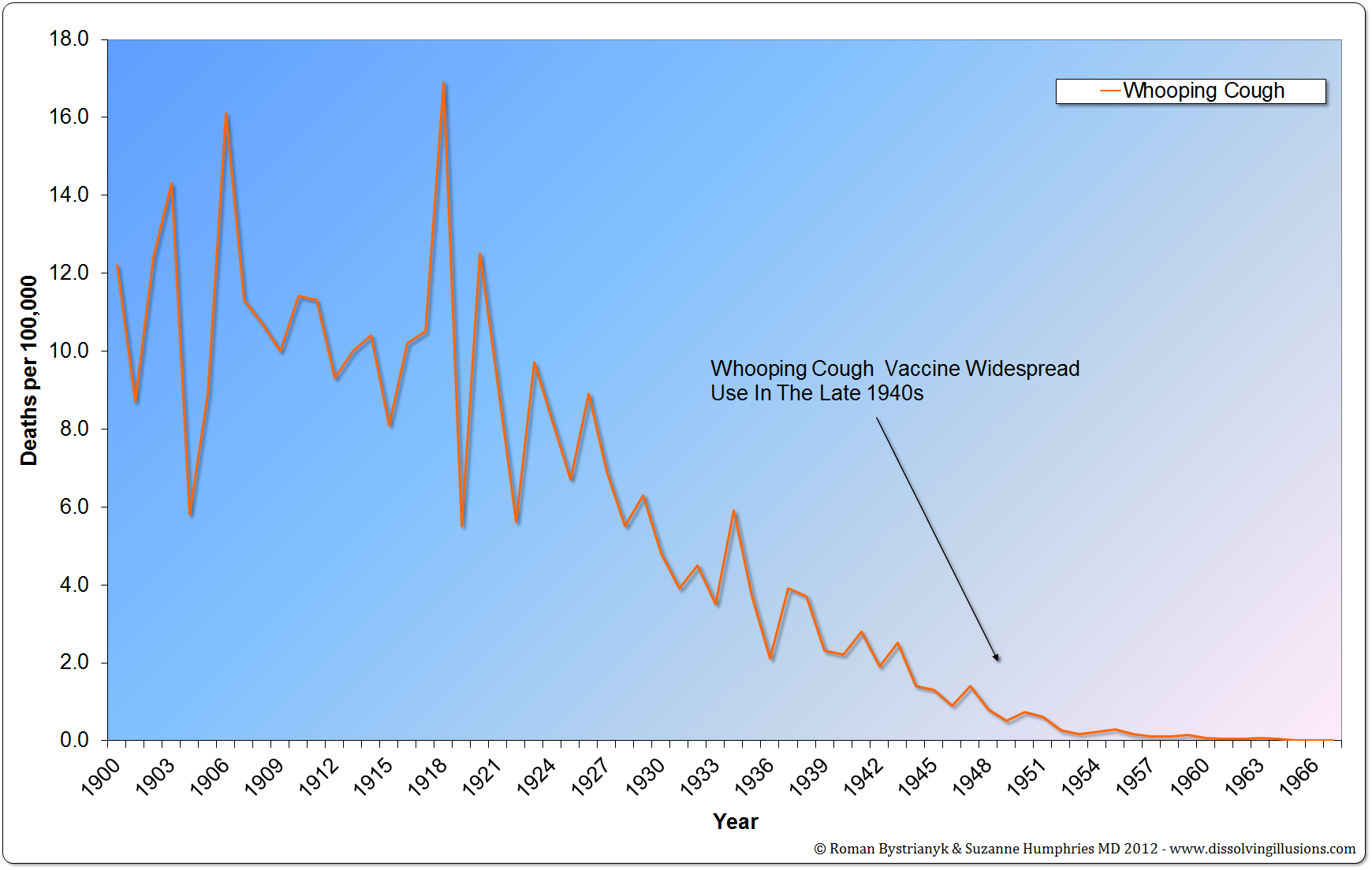 For Whooping Cough, the vaccines come into widespread use decades earlier than the Measles vaccine, but the majority of the decline in deaths had still occurred before their introduction. Furthermore, the decline in Whooping Cough deaths simply continued after the vaccine’s introduction as it had already been doing before the vaccine.