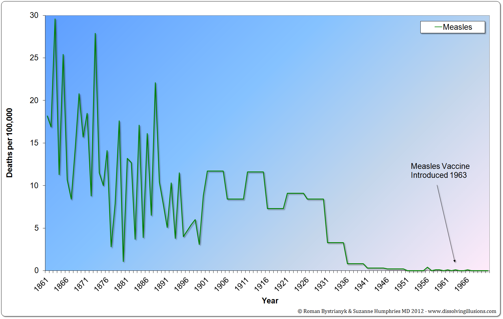 As you can see, almost all the decline in measles deaths in the USA (98.6%) occurred before the introduction of the measles vaccine in 1963. This decline in measles deaths before the introduction of the measles vaccine was even more dramatic elsewhere. Let’s look at another chart of measles deaths from Dissolving Illusions, this one for England and Wales.