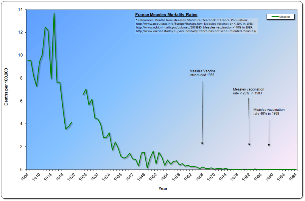 France Measles Mortality Rates 1906-1998 (Deaths from Measles: Statistical Yearbook of France; Population: http://www.populstat.info/Europe/francec.htm; Measles vaccination < 20% in 1983: http://www.ncbi.nlm.nih.gov/pubmed/6878995)