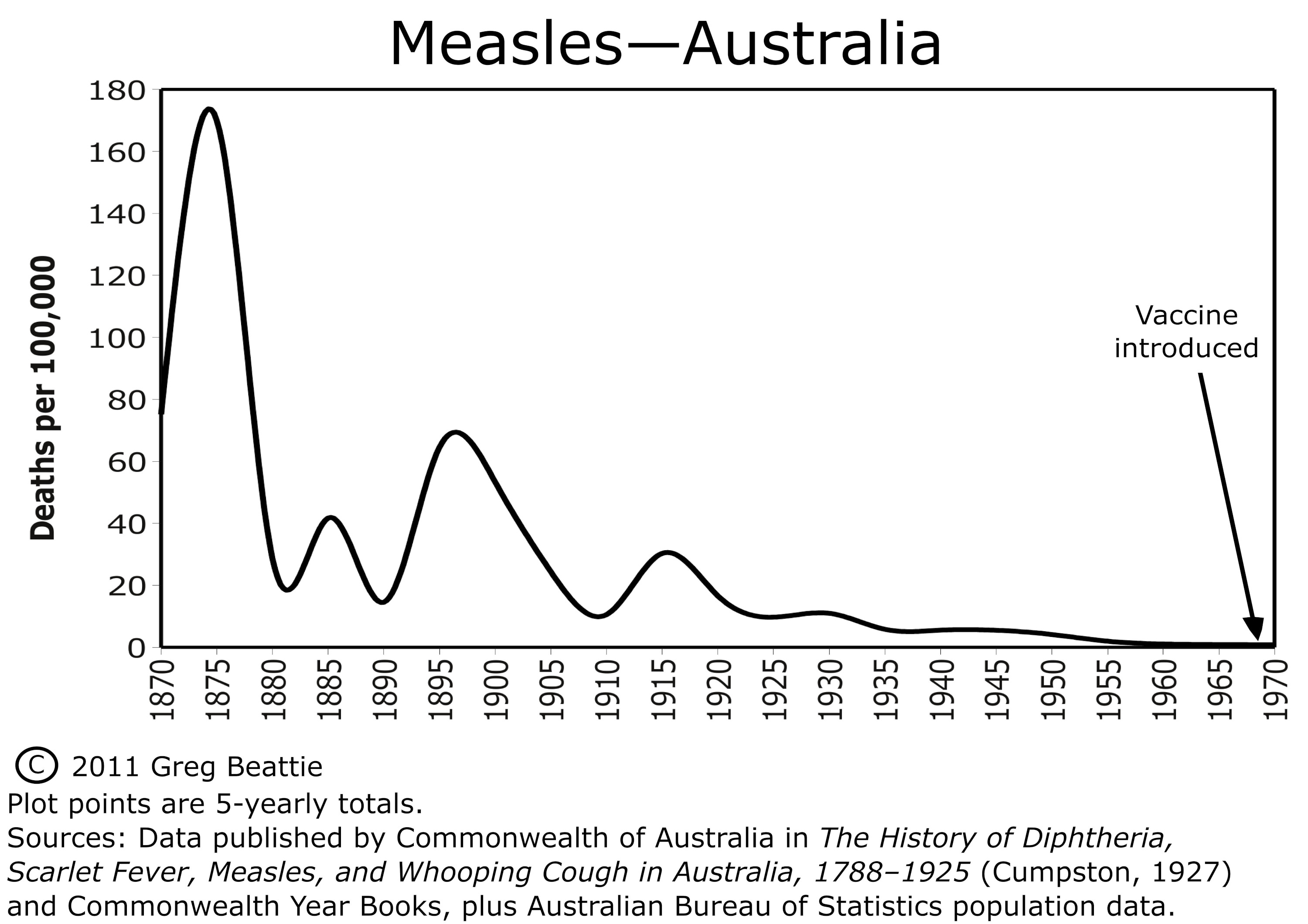 Thanks to the work of Bystrianyk and Humphries we have now seen, through graphs, the same dramatic decline in measles mortality, before the introduction of the vaccine, for England/Wales, France, and the United States. Now let’s look at a geographically very different place that also kept detailed vital records reaching back into the 19th century – Australia.