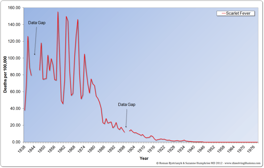 The book Dissolving Illusions details reasons why health authorities may prefer not mention to the Scarlet Fever vaccine at all. I’ll leave you to read that for yourself in Bystrianyk and Humphries’ book that I so highly recommend. For now, though, suffice it to say that we can rule out the Scarlet Fever vaccine from the list of potential reasons for the dramatic decline in Scarlet Fever deaths.