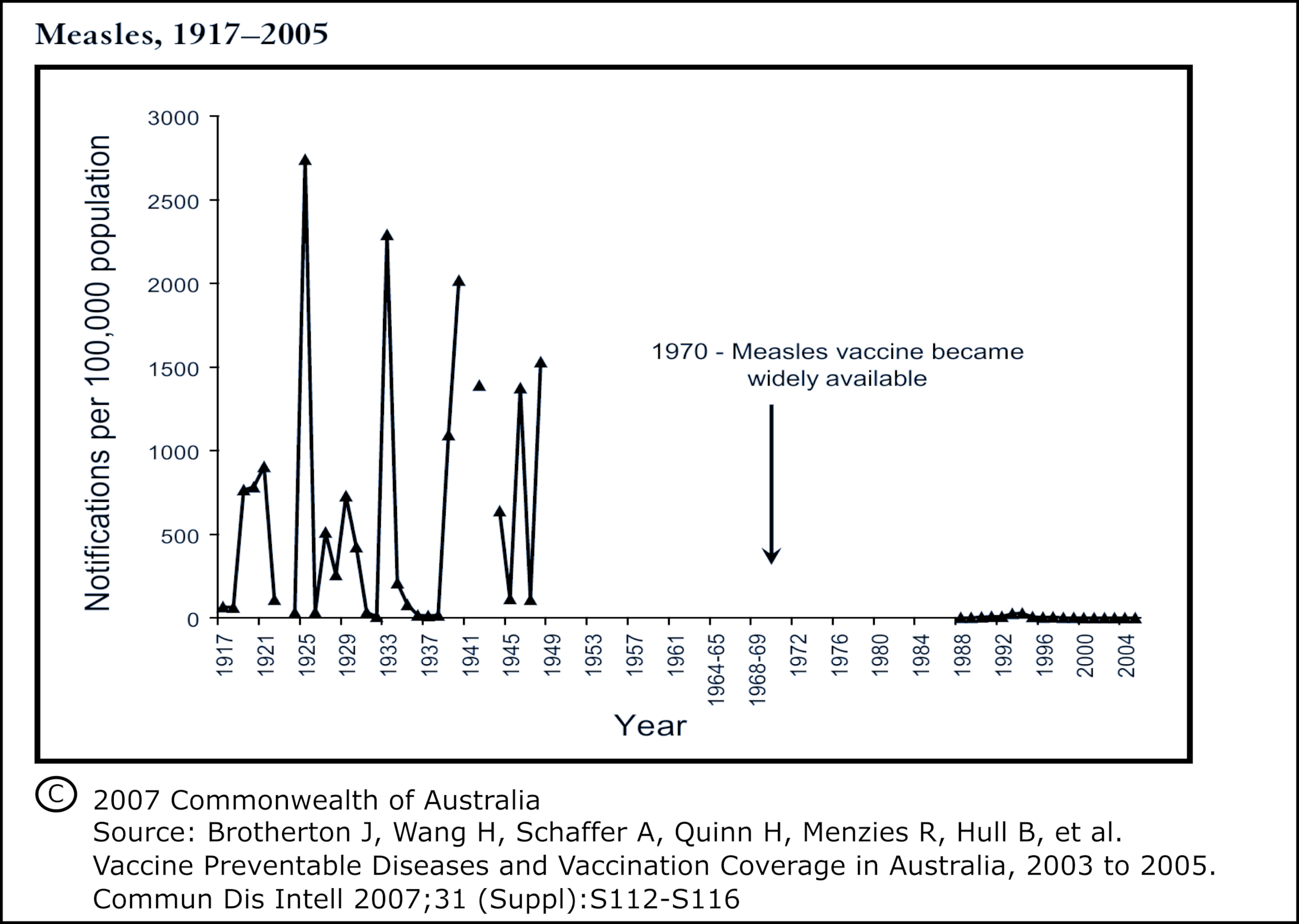 “In the case of measles, we immediately see that 40 years of data is missing surrounding the introduction of the vaccine. Notifications were not compiled nationally from 1949 to the mid-1980s when the National Campaign Against Measles began. Even the data prior to 1949 is scanty. Measles was not a notifiable illness in most states.” – Greg Beattie: Fooling ourselves on the fundamental value of vaccines.