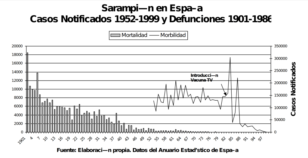 “Las cifras declaradas del sarampión, en la época en que era muy frequente, estaban siempre infravaloradas: cuando un médico ve docenas de casos, es fácil que se olvide de declarar una buena parte. Cuando se introdujo la vacunación debió de hablarse del tema. Seguro que los médicos recibieron información sobre el sarampión y su importancia, y se habló en la prensa y hasta en la tele. Probablemente los médicos pusieron más cuidado en declarar los casos de sarampión que veían. Por lo tanto, las cifras de incidencia tras el inicio de la vacunación probablemente siguen estando infravaloradas, pero son más próximas a la realidad que las anteriores. Es decir, el pico que vemos en la gráfica se debe a que sí, hubo una epidemia de sarampión, pero también a que se puso más cuidado en intentar declarar todos los casos.”