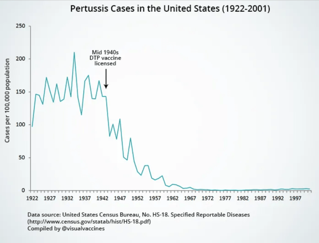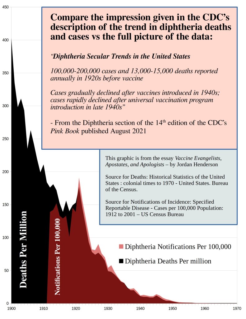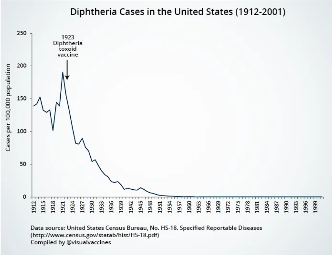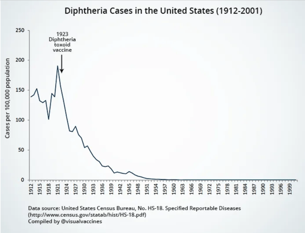This is a prime example of apologists employing the post hoc fallacy; the mere development of a toxoid vaccine in 1923 is treated by Isabella as reason enough to credit subsequent decline in deaths and cases to this vaccine. Critical considerations like identifying when enough people were actually getting the vaccine for it to – even in theory – have been a major contributor to the decline are skipped over entirely.