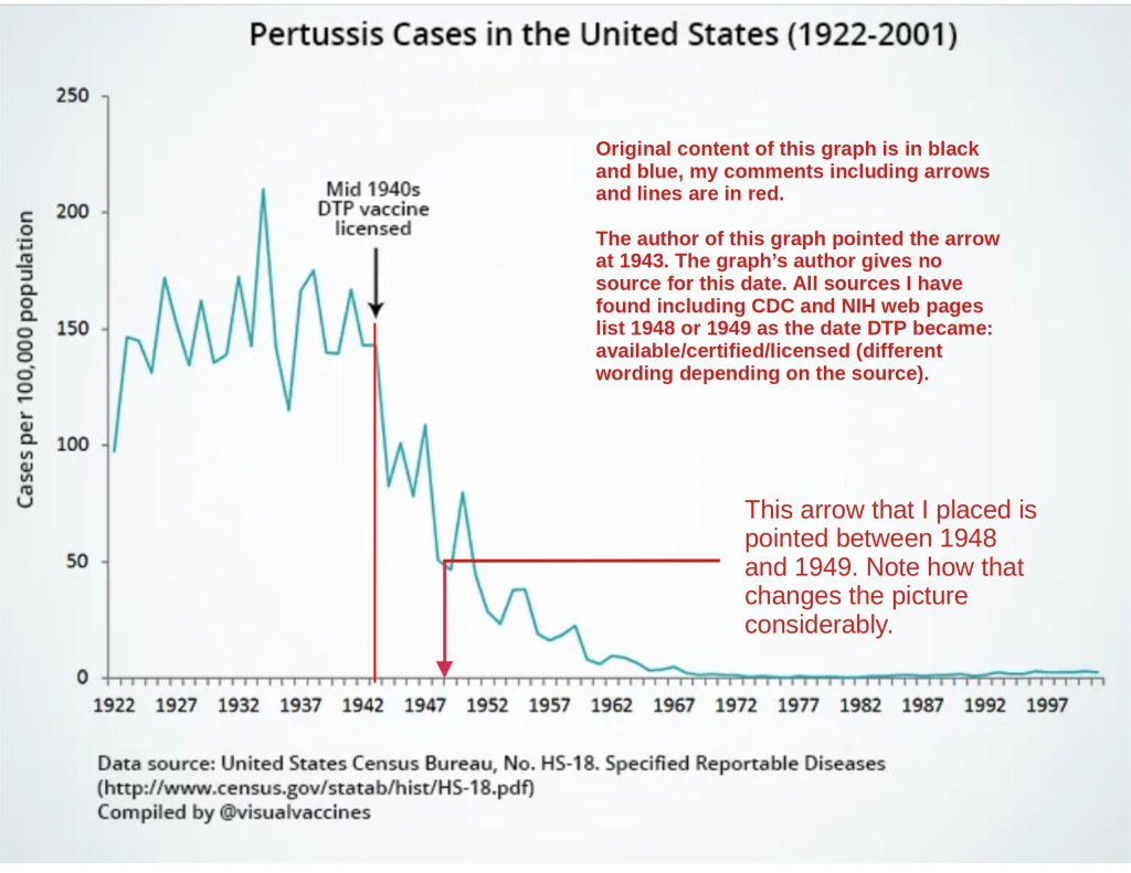 There were some pertussis vaccines being developed and used here and there in the US before the DTP vaccine; no doubt our vaccinationist friends would simply give any credit they can’t give to the DTP vaccine to its precursors if these graphs with corrected arrow placement were brought to their attention. Whether or not enough people actually even got those early pertussis vaccines for them to plausibly be credited for much of anything at the national level is not the sort of detail they would allow to get in their way.