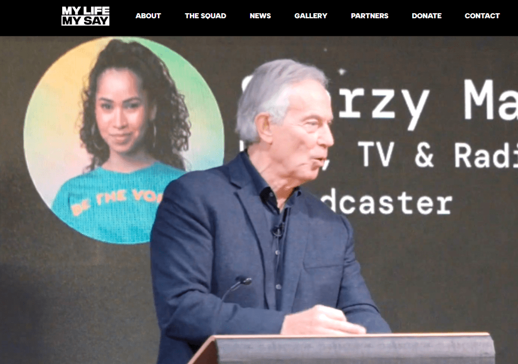 In 2019 a group of young people were lucky enough to be addressed by Blair via a large TV screen, as he “clarified” what My Life My Say described as “his on going support” for the organisation.