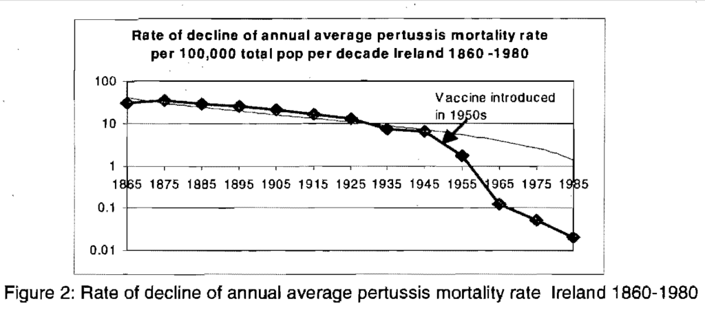 “It is often stated that the numbers of deaths from childhood infectious disease were declining before the introduction of vaccines. This is true for some diseases. It is also true that the introduction of vaccines has accelerated this decline, (for example see figure 3, rate of decline of pertussis deaths in Ireland).” [sic – they meant figure 2, figure 3 in the document is case notifications]