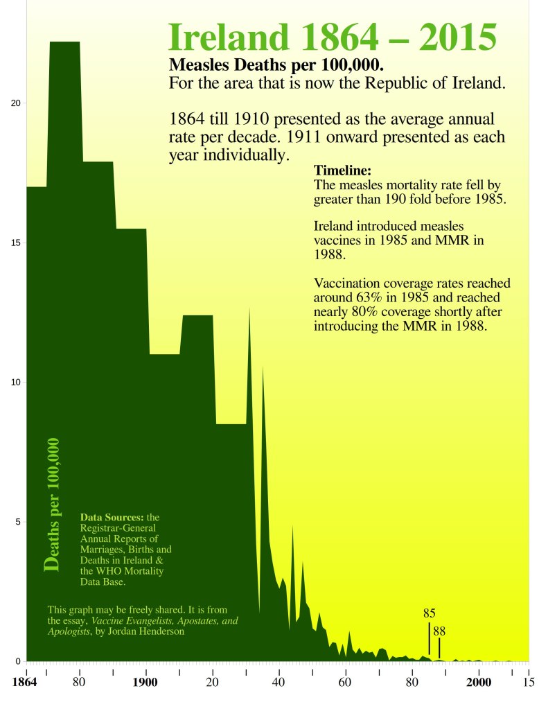 And there we have a likely answer. Though the measles mortality profile for Ireland is very similar to the whooping cough mortality profile, the measles vaccine was introduced three decades later, so even with a logarithmic scale presented to an audience unaccustomed to logarithmic graphs, that still would not have hidden the reality of all the dramatic decline occurring pre-vaccine.