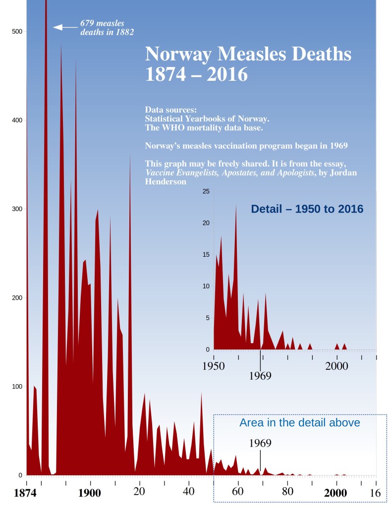 Both Norway and Denmark had steeply declining, similar measles death rates before either of them had a vaccine program. The average yearly measles death rate in the 1960s was – 0.97 per million population in Norway, and 1.16 per million population in Denmark.