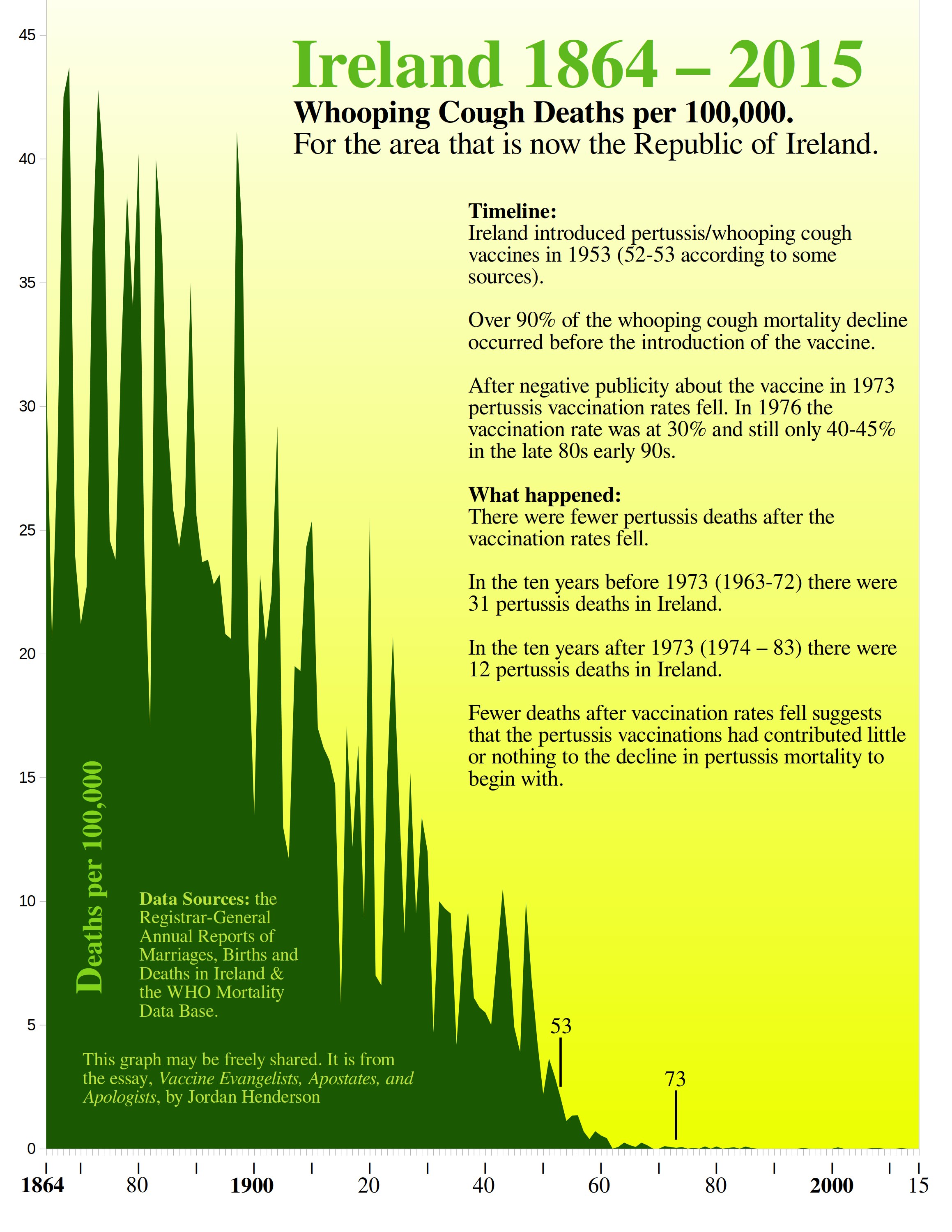 “It is often stated that the numbers of deaths from childhood infectious disease were declining before the introduction of vaccines. This is true for some diseases. It is also true that the introduction of vaccines has accelerated this decline, (for example see figure 3, rate of decline of pertussis deaths in Ireland).” [sic – they meant figure 2, figure 3 in the document is case notifications]