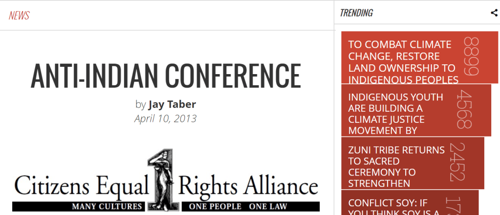 Anti-Indian Conference, the story I broke at IC Magazine in April 2013, revealed the emergence of a national campaign to terminate tribal sovereignty in the US, organized in the Pacific Northwest by the same people who fomented interracial discord there in the 1990s. Organizational names had changed, and the Merchants of Fear building resentment against environmentalists and Native Americans are industrial developers this time, rather than commercial like before, but the patterns are the same.