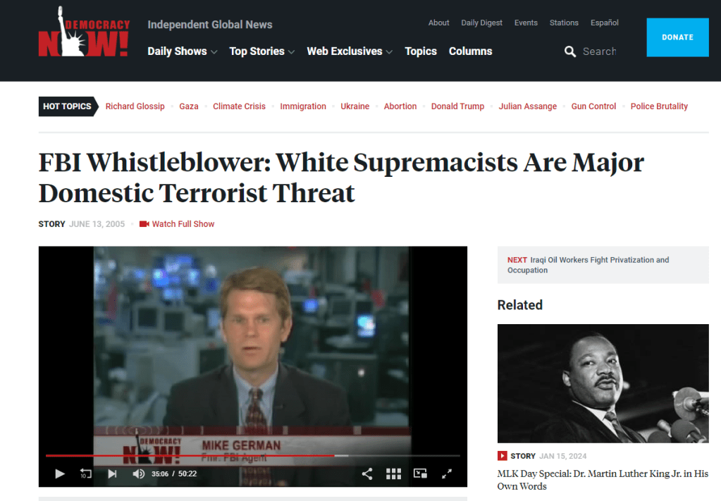 My post was about former FBI undercover agent Mike German, who had recently been interviewed by Amy Goodman on Democracy Now, discussing his career infiltrating violent white supremacist groups. The 1997 convictions of eight militia members in Washington state, for manufacturing explosives to murder human rights activists, were a result of German’s undercover operation, which was initiated in response to community-based research conducted by Public Good Project field agents, myself included.
