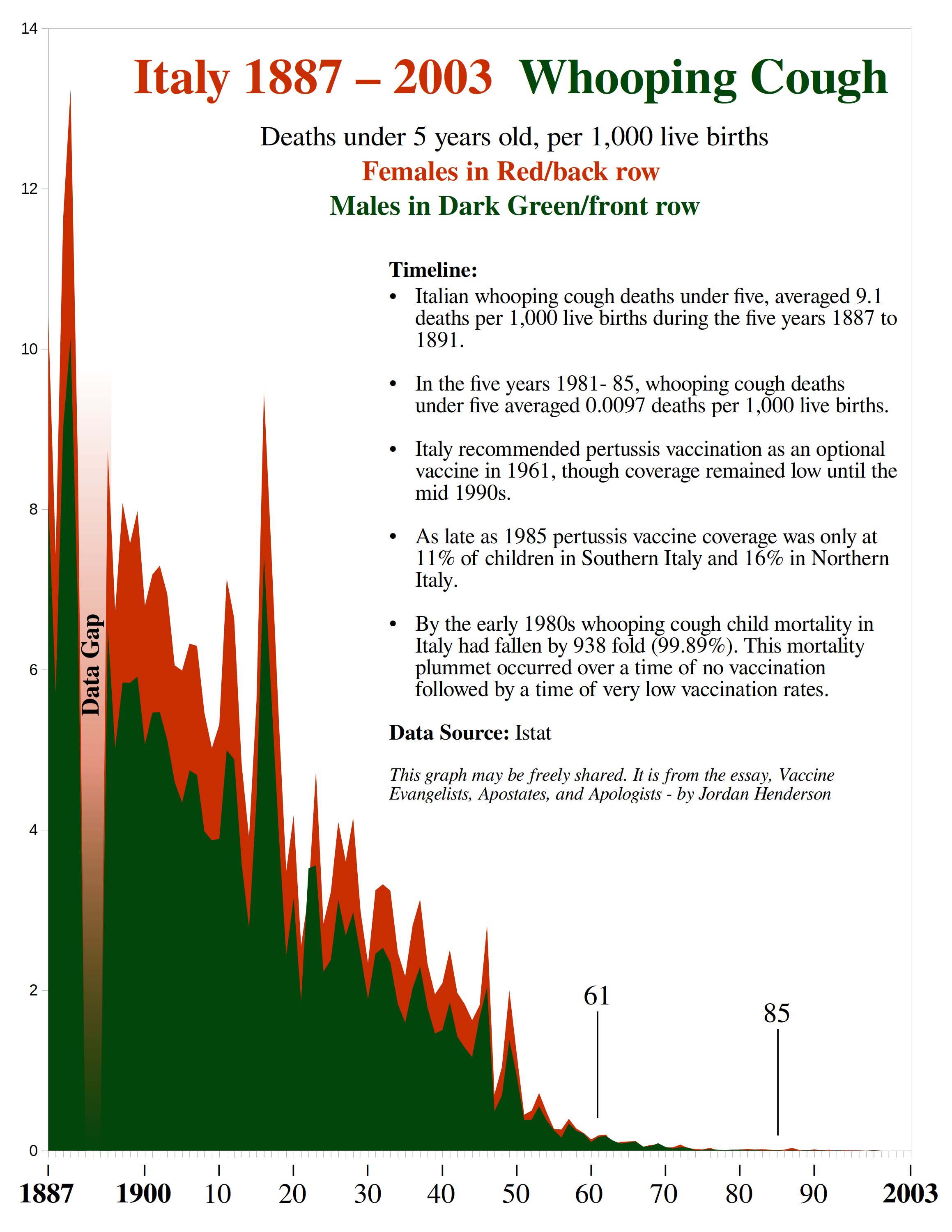 By the early 1980s whooping cough child mortality had fallen over 900-fold or 99.89% from what it had been less than a century earlier in Italy, and again, that is with most Italian children still being unvaccinated against whooping cough.
