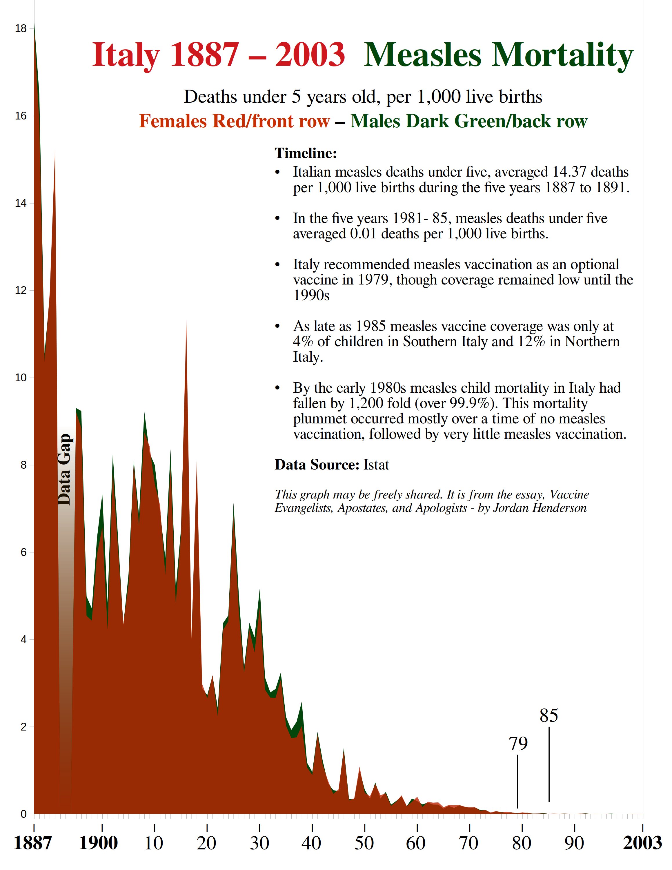 What makes the Italian mortality data especially noteworthy is that not only did Italy introduce pertussis and measles vaccines relatively late, it also did not initially introduce these vaccines as part of the country’s universal mandatory vaccination program. Most parents did not seek out these optional vaccines (as evidenced by a major 1985 survey). As late as the mid 1980s only a small minority of Italian children were receiving the recommended measles and pertussis vaccines.