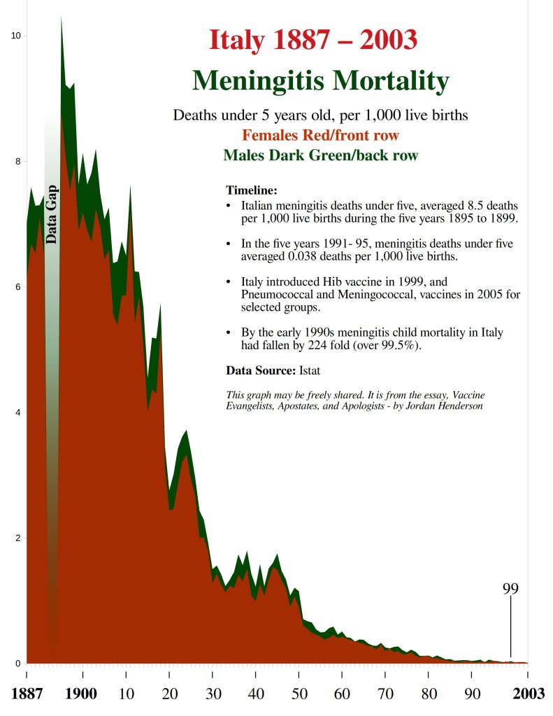 Here we have another major mortality decline in Italy, with almost all of the decline occurring before relevant vaccines (such as Hib, Pneumococcal and Meningococcal vaccines) had been added to the schedule.
