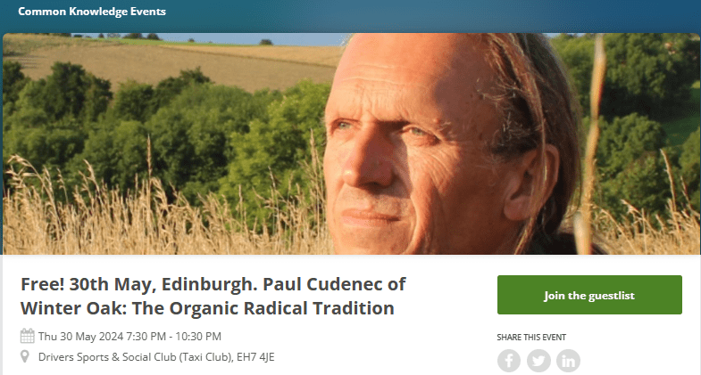 Winter Oak’s Paul Cudenec will be speaking in Scotland on Thursday May 30, 2024, about the organic radical philosophy. The evening, organised by Common Knowledge Edinburgh, is free to attend, although people are asked to sign up in advance for their place. It starts at 7.30pm.