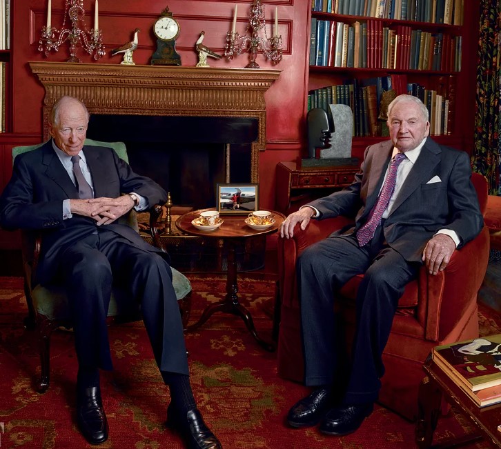 Describing the relationship between now-deceased elders David Rockefeller and Jacob Rothschild (pictured), the article says: “They have known each other for 50 years; they have also had parallel lives, growing up on grand estates and surrounded by an abundance of art, ancestors, and siblings… They both jumped into careers in finance”. [249]