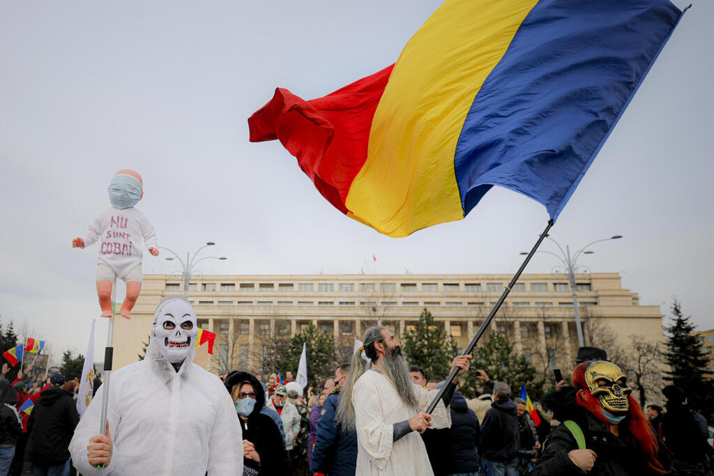 In Romania thousands of protesters took to the streets of Bucharest, chanting “Freedom!” and “Down with the mask,” and bearing the message “Say no to forced vaccination!”