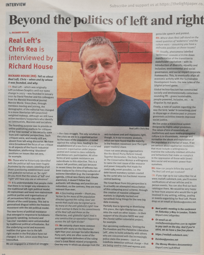 In an interview with The Light Paper, the Real Left’s Chris Rea criticises the failure of many in the “freedom” movement “to name the root cause of the resource and power inequality that made the Covid-1984 event possible, i.e. the debt-based monetary system created by the cartels who run fractional reserve central banking”.