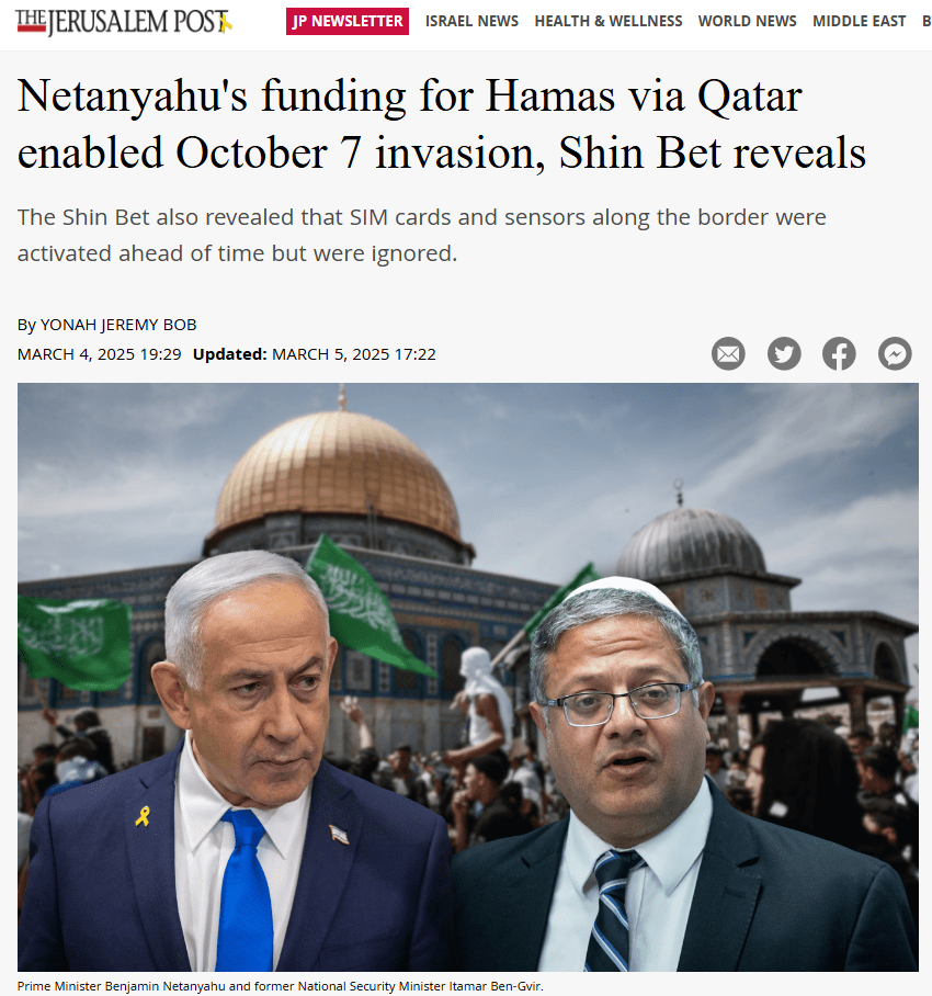“Netanyahu’s funding for Hamas via Qatar enabled October 7 invasion, Shin Bet |Israeli intelligence] reveals. The Shin Bet also revealed that SIM cards and sensors along the border were activated ahead of time but were ignored”. Anti-semitic conspiracy theory? No, a report in The Jerusalem Post on March 4 2025.
