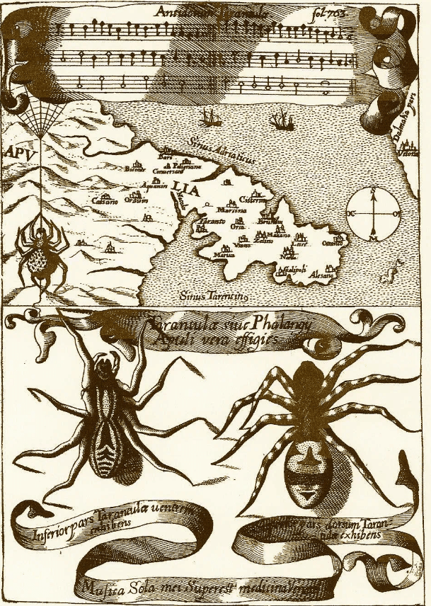 Kircher wrote in the 17th century: “The different spiders create in those bitten a passion for different colours… so that those who were bitten by a red spider have a liking for red; those who were bitten by a green spider have a liking for green, and so on.